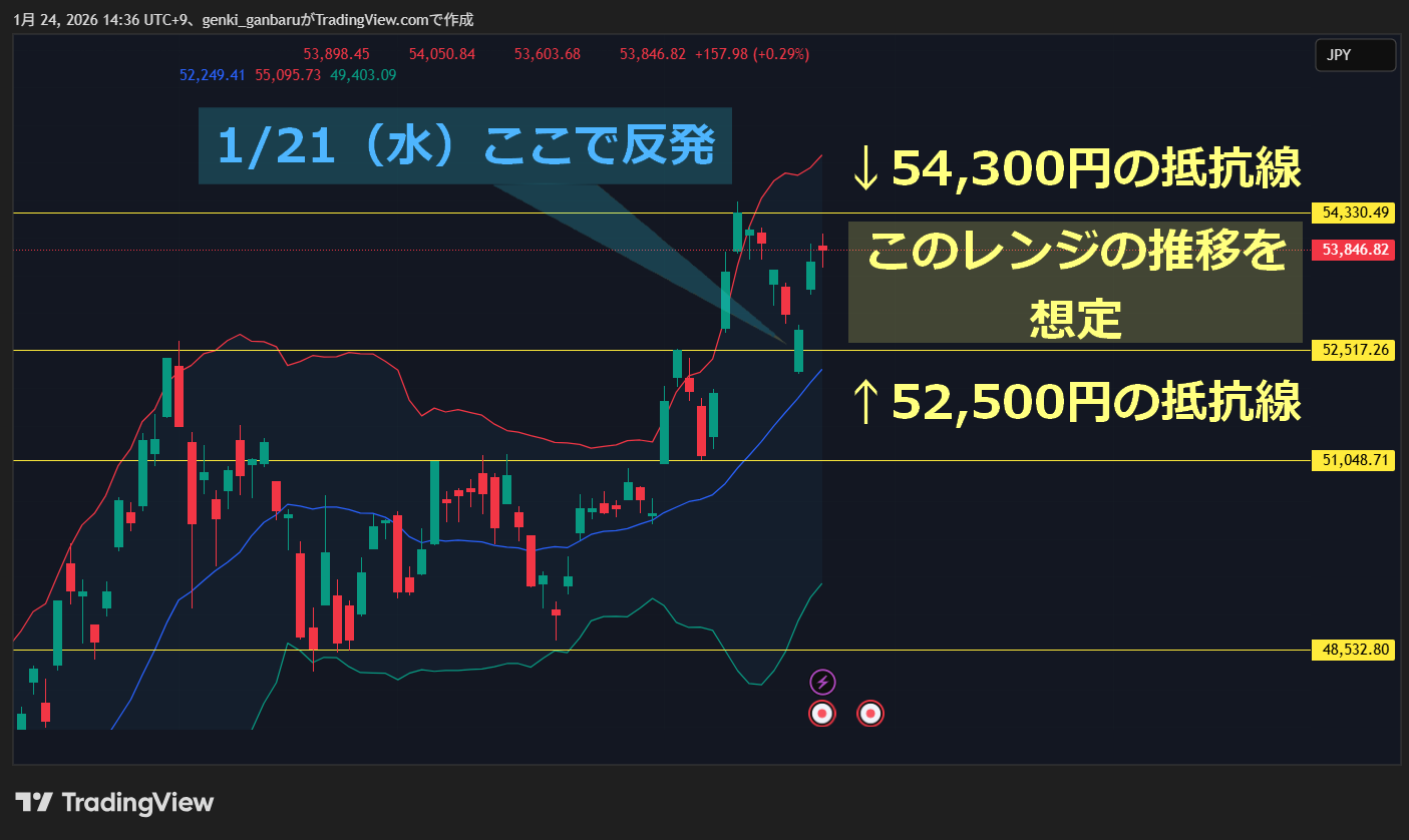 株価のレンジとしては、直近の最高値の54,300円から下値の抵抗線である52,500円での推移を見込んでいる(↑のチャート参照)。