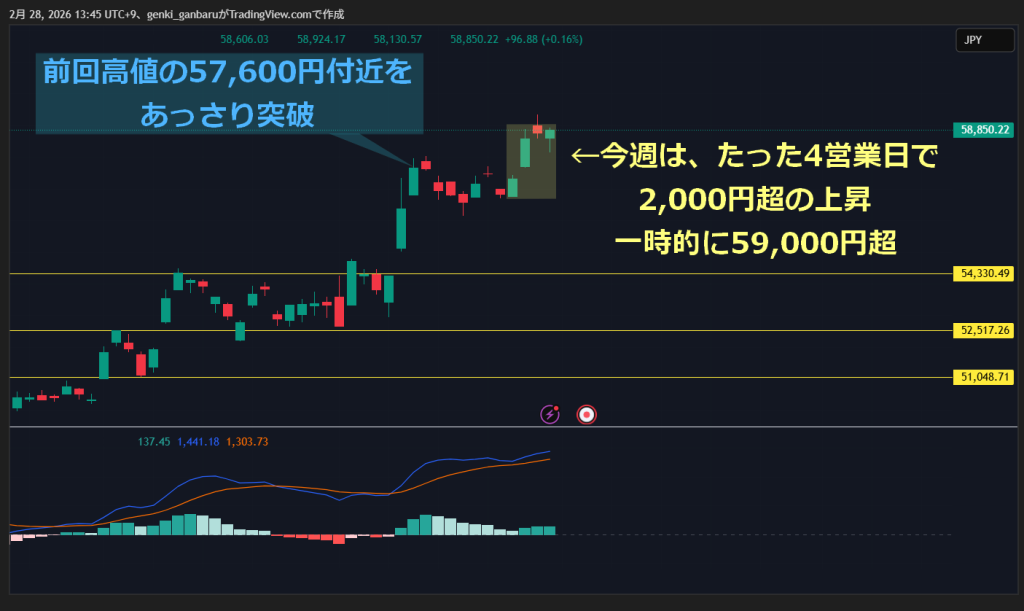 でも、今週だけで2,000円以上上昇しており、ピッチが早い(↑のチャート参照)。
