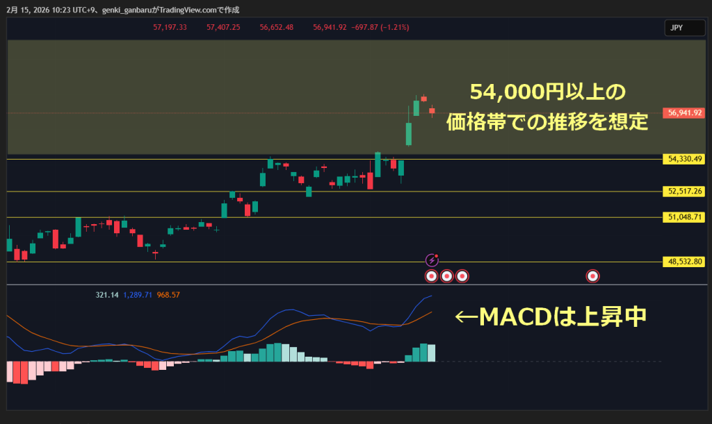 日経平均の日足のチャート上は、上値抵抗ラインが見当たらず、MACDも上昇中だ(↑のチャート参照)。