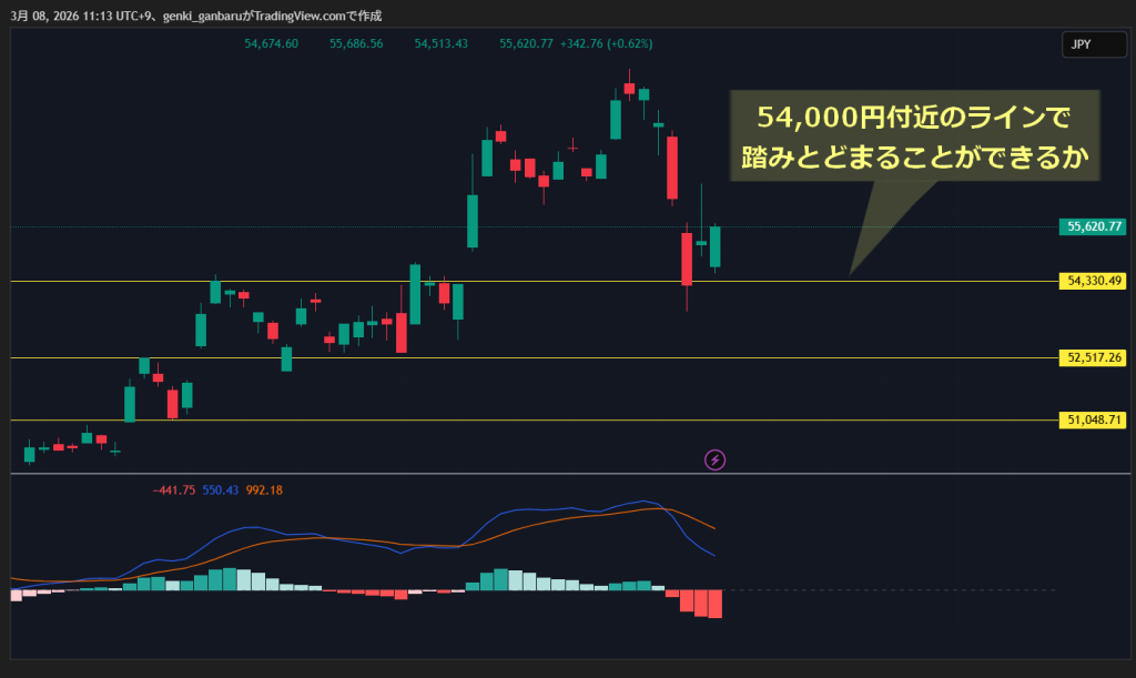 54,000円付近にサポートラインがあり、そこを割り込んでくると、もう一段下の52,500円付近のラインが目途になってくる。