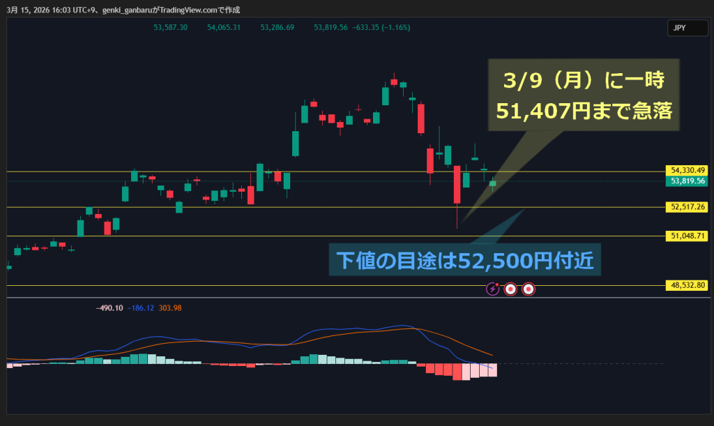 当面の日経平均株価の下値の目途は52,500円付近になると想定している(↑のチャート参照)。