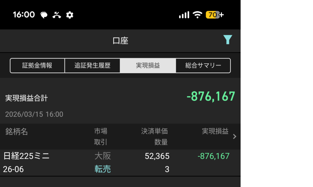 日経平均先物(ミニ)3枚の買い建玉を決済
